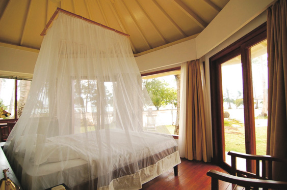 Die insgesamt 40 großzügig gestalteten Cottages und Villen sind geschmackvoll im indonesischen Stil unter Verwendung von Teakholz eingerichtet und verfügen über eine großzügige Terrasse, Klimaanlage, Ventilator, Moskitonetz, Minibar und Föhn. Die insgesamt 15 Cottages liegen nur ca. 15 m vom Strand entfernt. Die Superior-Meerblick-Cottages (ca. 33 qm) sind in Bungalows mit 2 Einheiten untergebracht. Die Deluxe-Meerblick-Cottages (ca. 35 qm) sind einzelstehende Bungaloweinheiten. Alle Bungalows bieten einen wunderbaren Blick auf die türkisfarbene Lagune. Die exklusiven Pool-Villen (ca. 320 qm) bieten zusätzlich Safe, CD-Spieler sowie einen privaten Swimmingpool (8x4 m) mit 2 Gazebos, Sonnenliegen und einen offenen Wohnbereich. Die luxuriösen Familien-Pool-Villen (ca. 600 qm) bieten zusätzlich zwei großzügige Schlafzimmer.