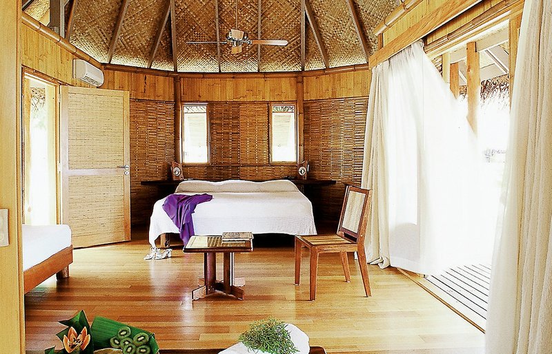 Overwater Bungalow: ca. 55 qm, Überwasserbungalow auf Pfählen. Ausstattung wie Beach Bungalow, mit normalem Badezimmer sowie einem in den Fußboden eingebauten Glastisch, durch den die Unterwasserwelt beobachtet werden kann.