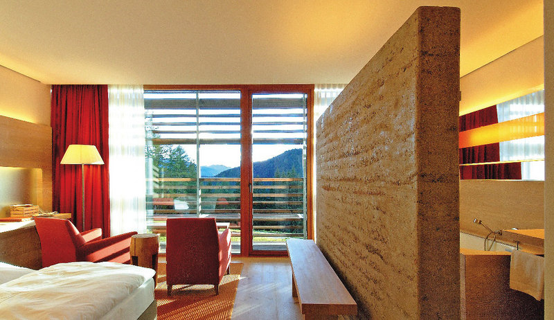 41 Zimmer und Suiten in modernem, hellem Holzdesign mit großen Panoramafenstern, Blick auf die Lärchenwälder oder die umliegende Südtiroler Bergwelt. Ausgestattet mit Bad, separater Dusche, Bademantel, Föhn, Telefon, HDSL-Internetanschluss (ohne Gebühr), Hifi-Stereo mit iPod-Anschluss, Minibar, Safe, Balkon bzw. Terrasse. Um diesem Ort seine Stille zu bewahren, wird das Fernsehgerät nur auf Anfrage bereitgestellt.