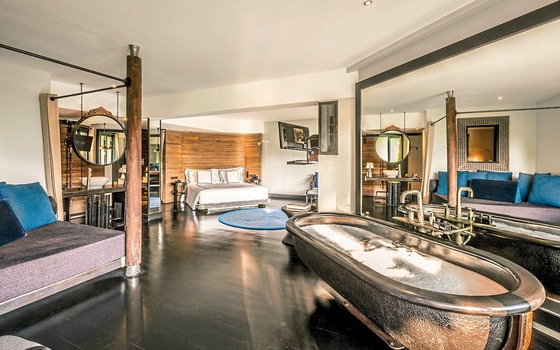 Das luxuriöse, weitläufige Design-Hotel wurde mit hochwertigen Materialien im Stil einer Zinnmine erbaut und erinnert mit liebevoll gestalteten Details an die alte, bereits vergangene Zinnschürfer-Geschichte Phukets.