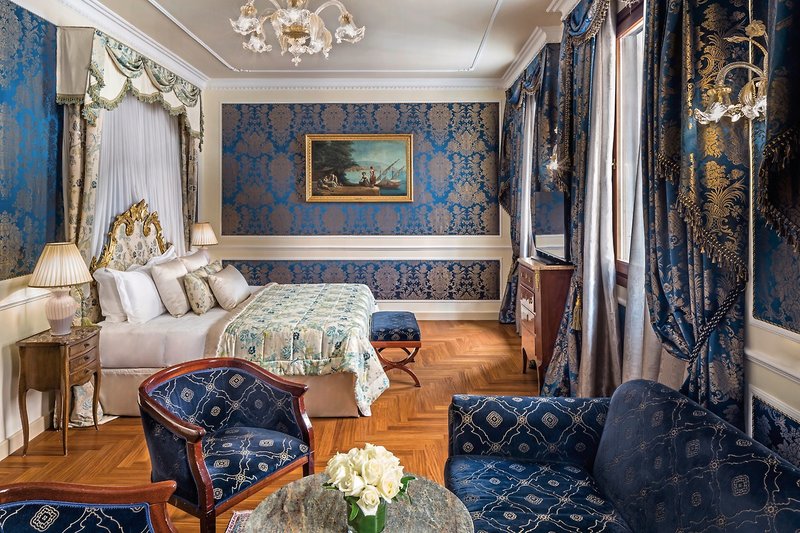 Die Zimmer: Die 92 Zimmer, einige mit eigenem Balkon mit Blick auf die Lagune Venedigs, sind prunkvoll dekoriert und mit Bad, Bademantel, Föhn, Kabel-/Satelliten-TV, Klimaanlage, WLAN, Telefon, Minibar und Safe ausgestattet.