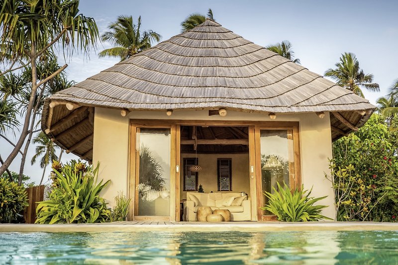 DIE ZIMMER: Die 11 Villen sind alle aus natürlichen Materialen hochwertig gebaut, sind hell und freundlich und bestechen trotz ihrer Einfachheit durch lokales Kunsthandwerk, Bequemlichkeit und Komfort. Alle Villen verfügen über einen privaten, kleinen Pool, einen großzügigen Außenbereich mit Dusche, eine Dachterrasse, Liegemöglichkeiten am Strand und Butler-Service. Ausgestattet mit Kingsize-Bett, Bad mit Regendusche, Föhn, Satelliten-TV, Kaffe-und Teezubereiter, Minibar, Klimaanlage, Safe und WLAN (ohne Gebühr).